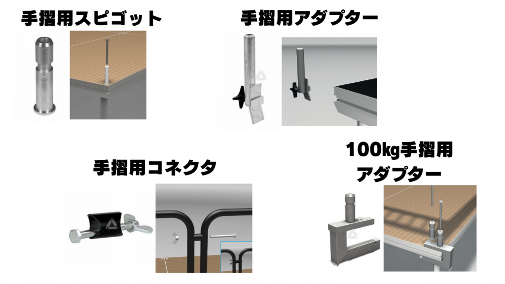 天板とレッグ(脚)、上記アクセサリーを組み合わせることによってフラットなステージを施工することが出来ます。