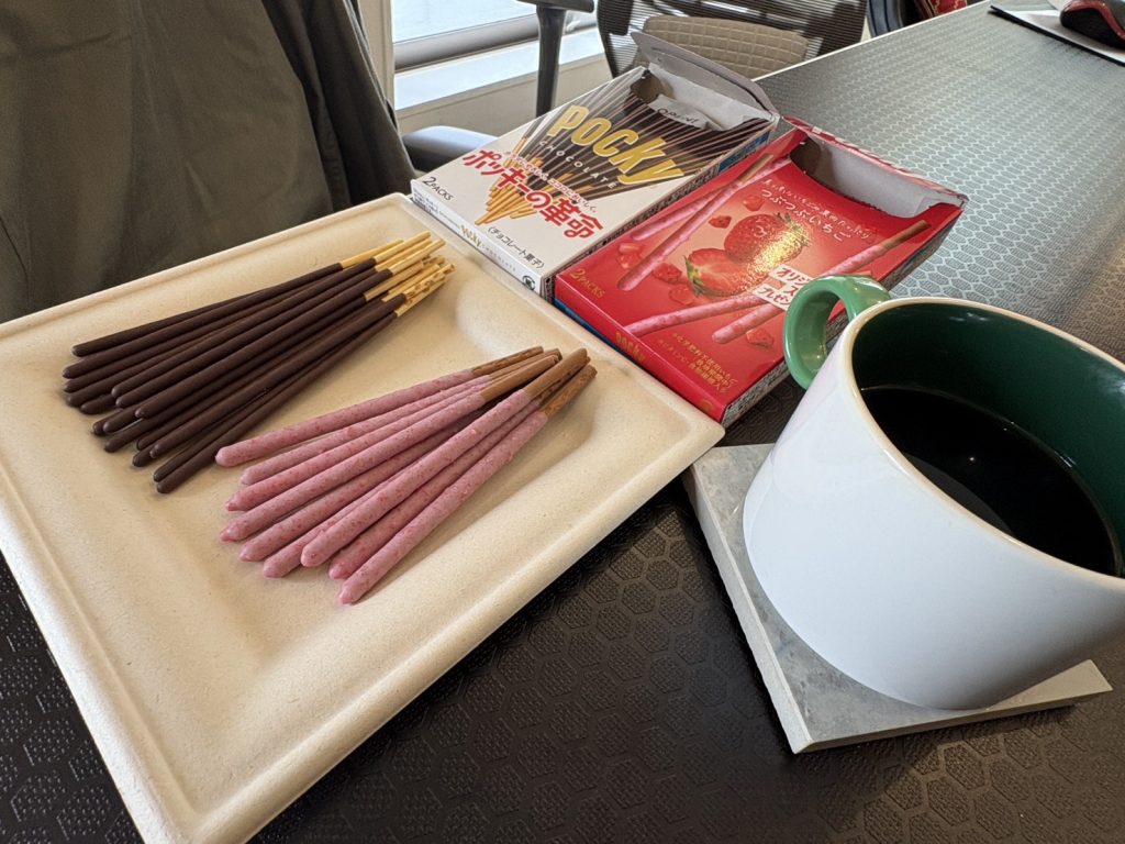 昨日は新宿事務所で会社の人とお昼休みに極細ポッキーイチゴ味ポッキーをシェアしながら食べました!