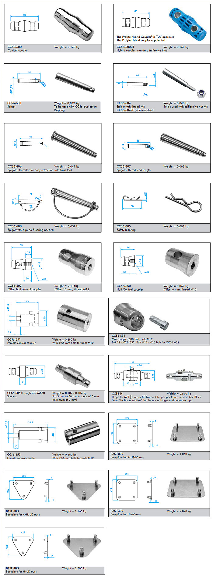 コニカルカップリングシステムは、プロライトの全てのトラスシステムに対応可能であり、3種類のサイズ:CCS4、CCS6、CCS7をご用意しています。また、さまざまな特注品もお取り扱いしております。