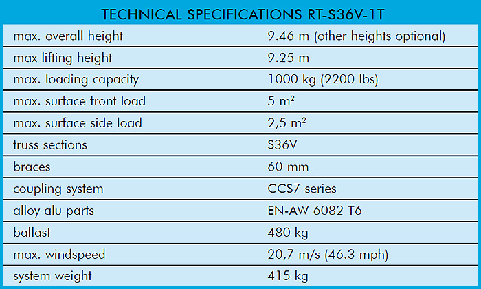 二種類目のリギングタワーはRT-S36V-1Tです。このミディアムデューティー用バージョンは1000kgまでの荷重に耐性があり、最高9,25mまでリフティングの高さを延ばすことか出来ます。このRT-S36Vリギングタワーは小さいスケールのイベントから中型のスケールのイベントに最適です。 S36Vトラスをベースとして、60mm管と415kgのリギングタワーそのものの重さを利用した安定装置により、このリギングタワーは柔軟でコスト効果のいい解決策となるでしょう。また、その比較的小さなサイズとハイテクなその見た目を持つリギングタワーは、屋外のイベント、公共の施設、展示会場、テーマパークといったどんな環境、異なる利用条件にもお使いいただける優れものです。