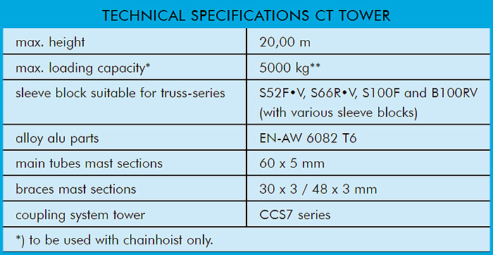 プロライトは「MPTタワー」と「STタワー」の全領域を補完する新しいシステムをご用意いたしました。新しい「CTタワー」はさらに高い荷重に耐えられるより高いタワー構造用にデザインされております。新しい「C52Tタワー」は全長20mに組立てられます。マスト部分はいくつかの標準タイプの長さに対応しています。(コード:C52T-L)