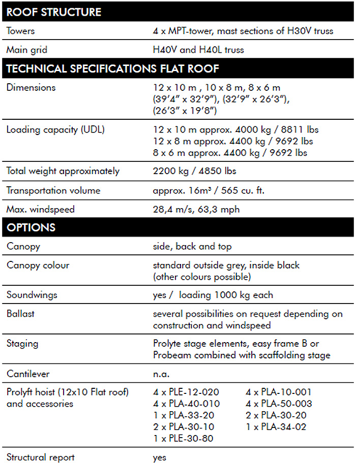 TFLATルーフは傾斜した屋根をもつタワーベースの構造体であり、組立がとても簡単です。屋根はステージの後方に向かって下向きに傾斜しています。主に標準のトラスで構成されています。屋根は3つのサイズからお選びいただけ、バライティ豊かな組立を演出いたします。