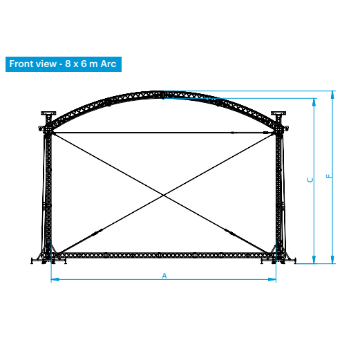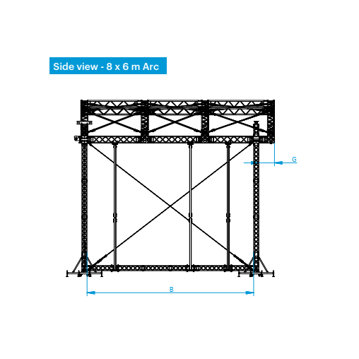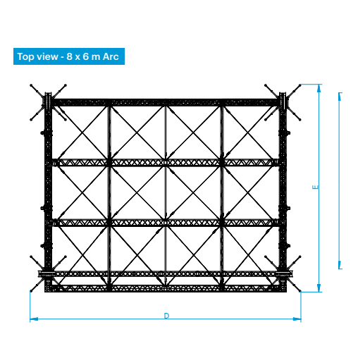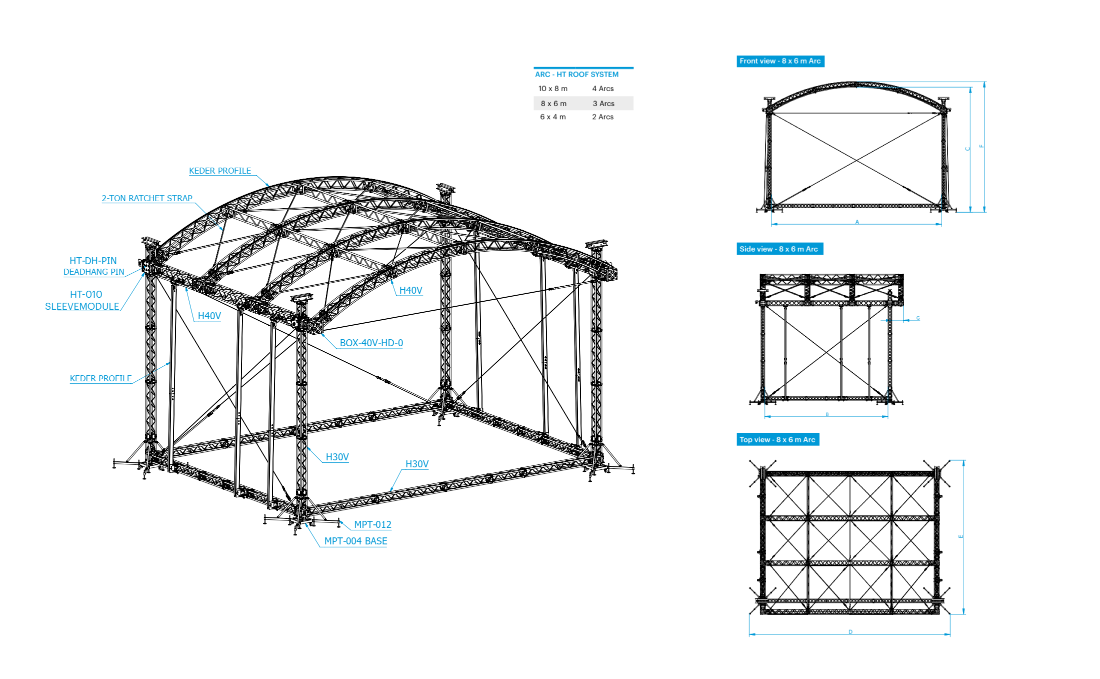 Arc-HTは新しいHTタワーをベースにしたシステムで、グリッドはH40Vトラスと新しいHD-Boxcornerで構成され、システムの強度を最適化しています。アーチはH40Vで構成され、その間にはコンプレッションメンバーが配置されています。