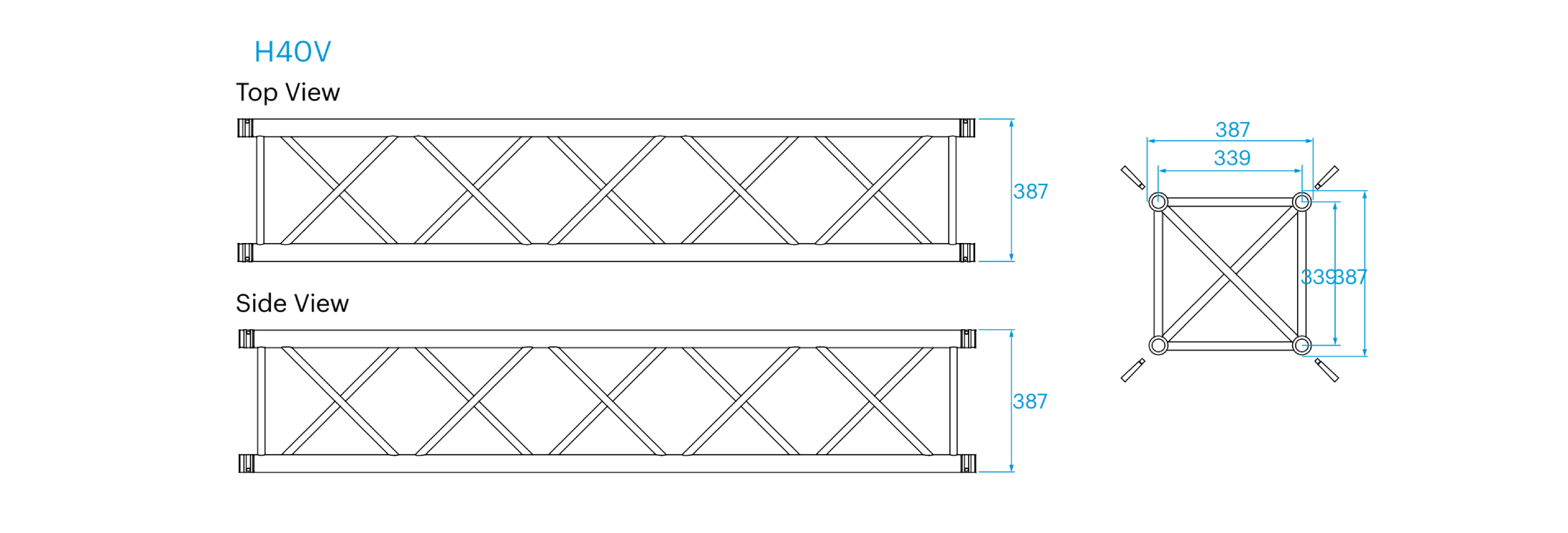 H40シリーズトラスは、メインコード(48 x 3 mm)と対角線部材(20 x 2 mm)